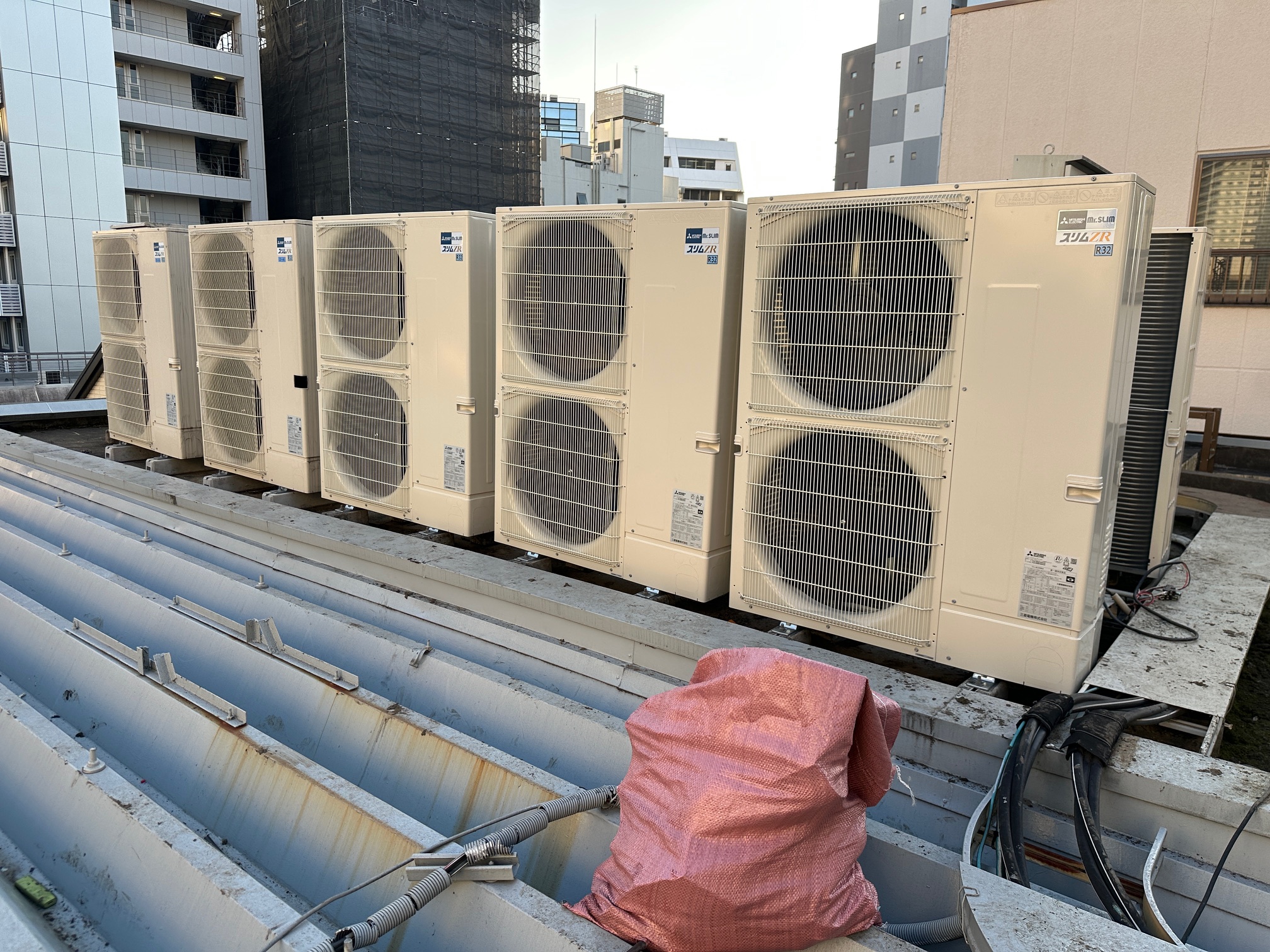 室外機入替完了。同能力でもサイズダウンするので屋上スペースもすっきりしました