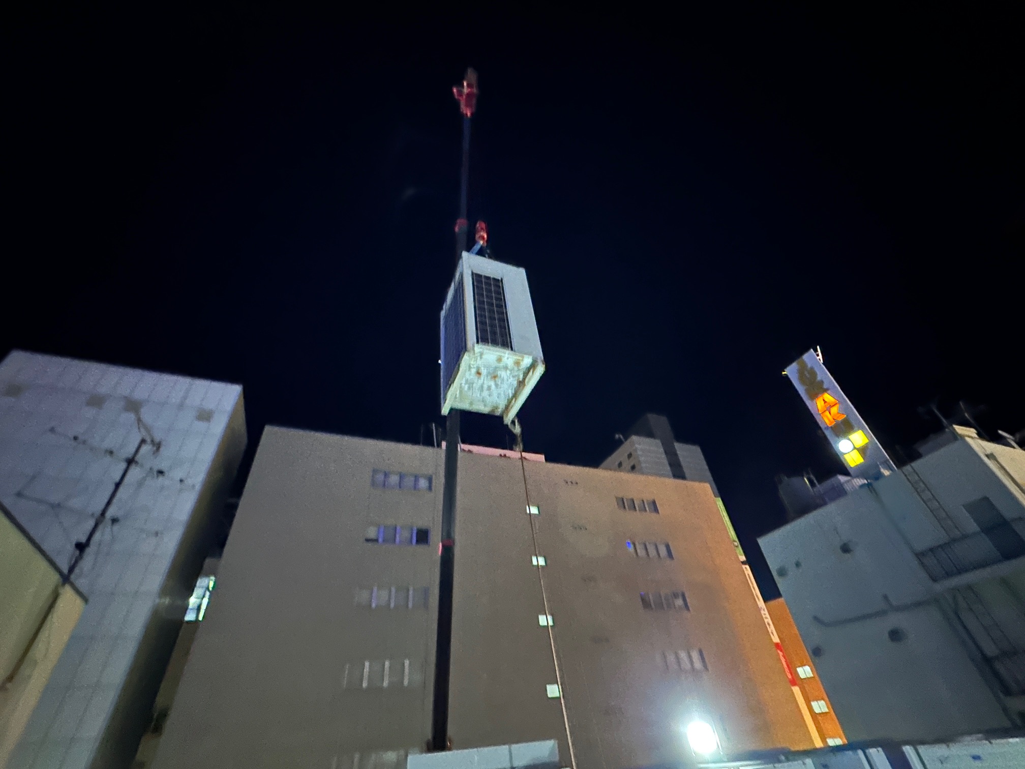 室外機揚重作業。隣接する時間貸し駐車場を貸し切って安全に作業します。
